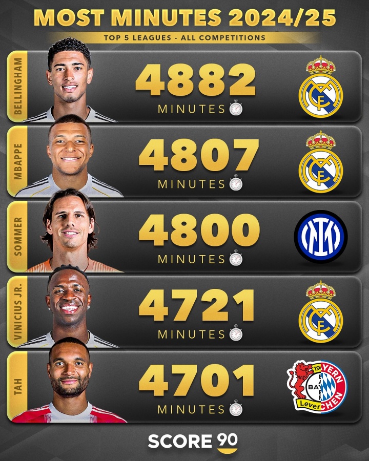 07月16日讯 随着世俱杯的结束,2024/25赛季也划上了句号。外媒score90统计了本赛季五大联赛球员在俱乐部的出场时间,巴尔韦德以5646分钟断层排名第一,第二是阿森纳门将拉亚。
